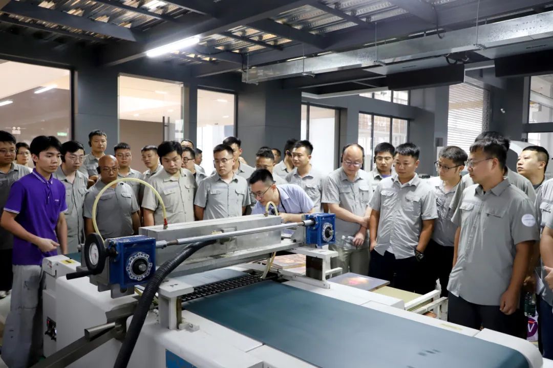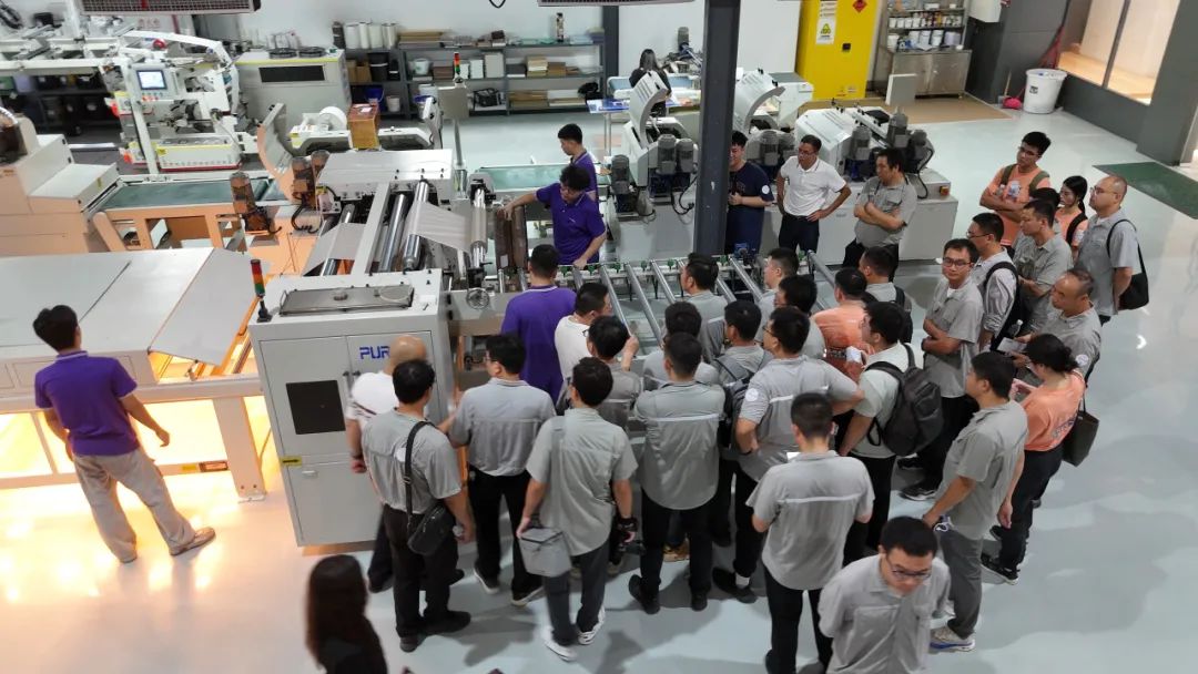 考察團分成兩組深入生產(chǎn)一線,開啟深度參觀。在專業(yè)引導員的引領下,從機加車間到裝配1車間,再裝配3車間內(nèi),先后參觀了輥涂、淋涂、噴漆、平貼、平壓等各個產(chǎn)線設備。這些先進的設備和智能化的生產(chǎn)流程,讓工程師們對表面涂飾工藝有了更直觀的認識,也感受到了普瑞特在智能制造領域的強大實力。